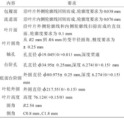 本文所研究整體葉輪零件圖樣如圖1所示,該葉輪為半開(kāi)放式整體葉輪,葉片數(shù)量為17,是某離心式空氣壓縮機(jī)的核心零件,葉輪三維結(jié)構(gòu)如圖2所示。該葉輪結(jié)構(gòu)比較復(fù)雜,葉片扭曲程度比較高,主要有葉片、流道、圓角、孔等特征。葉輪的主要加工難點(diǎn)為葉片面、流道面和葉根圓角,此位置加工時(shí)容易產(chǎn)生干涉,并且只能采用小刀具加工,效率低,葉輪內(nèi)孔尺寸要求以及內(nèi)孔與葉輪外輪廓的同軸度要求都比較高,零件主要加工內(nèi)容如表1所示。
