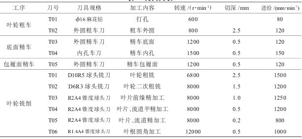 三爪夾盤夾持,完成葉輪底面臺(tái)階圓、臺(tái)階孔精車;第3次裝夾采用三爪夾盤和軟爪夾持,完成葉輪孔和輪轂的精車;第4次裝夾采用專用夾具夾持,完成葉輪銑削加工。工藝路線制定如下:1)備料。0Cr17Ni4Cu4Nb棒料,尺寸為220 mm×95 mm。2)打孔。在數(shù)控車床上用三爪夾盤夾持,打孔直徑為16 mm,深度貫通。3)粗車。粗車葉輪輪轂面,留2 mm精車余量。4)精車葉輪底面。在數(shù)控車床上零件掉頭,用三爪夾盤夾持,精車葉輪底面臺(tái)階外圓和臺(tái)階孔。5)精車葉輪包履面。在數(shù)控車床上用三爪夾盤和軟爪夾持。葉輪底面臺(tái)階外圓,精車內(nèi)孔和輪轂面。6)葉輪粗銑。在五軸聯(lián)動(dòng)加工中心上用專用夾具夾持,粗銑葉輪,流道方向和葉片方向各留0.5 mm精銑余量。7)粗銑葉片前緣。粗銑葉片前緣,留0.5mm精銑余量。8)葉片半精加工。半精加工葉片,葉片方向留0.2 mm精銑余量,流道方向留0.5 mm精銑余量。9)流道半精加工。半精加工流道,流道方向留0.2 mm精銑余量,葉片方向留0.5 mm精銑余量。10)葉片精加工。精加工葉片至零件圖樣要求。11)流道精加工。精加工流道至零件圖樣要求。12)葉根圓角精加工。精加工葉根圓角至零件圖樣要求。